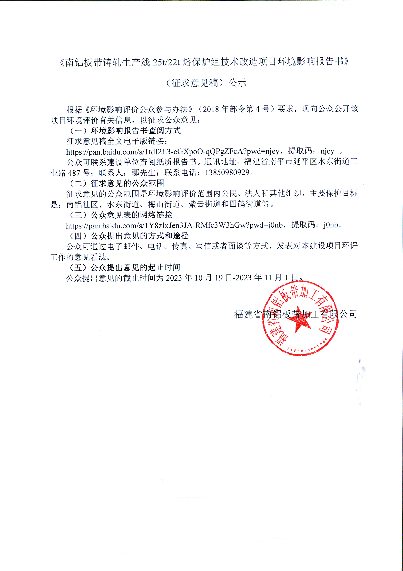《南鋁板帶鑄軋生產(chǎn)線25t22t熔保爐組技術(shù)改造項(xiàng)目環(huán)境影響報(bào)告書(shū)》報(bào)批前公示