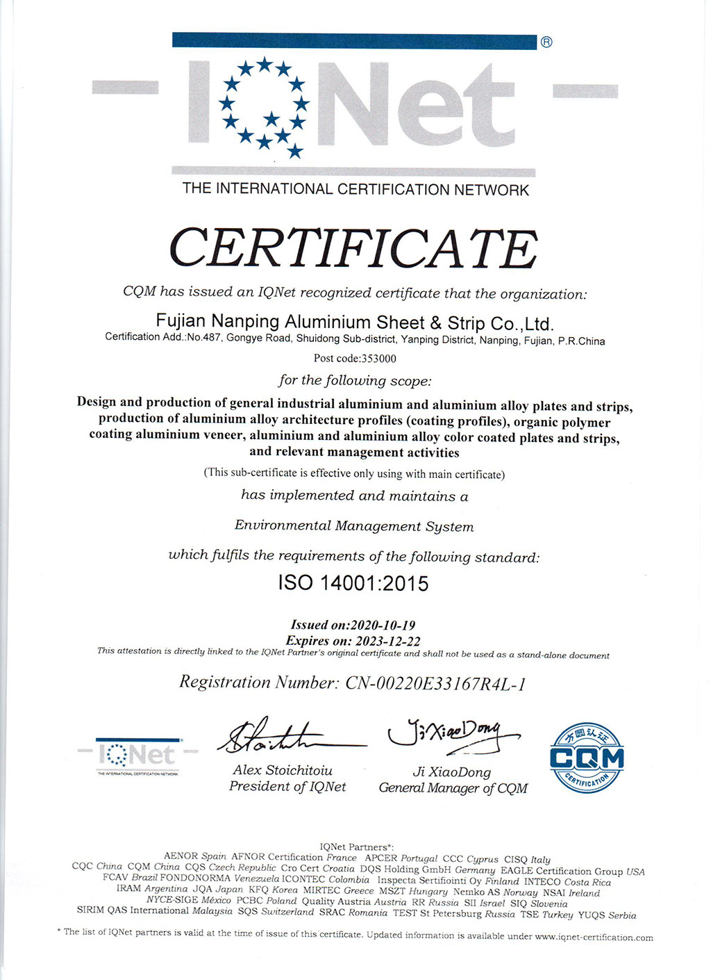 ISO14001IQNet證書--南鋁板帶